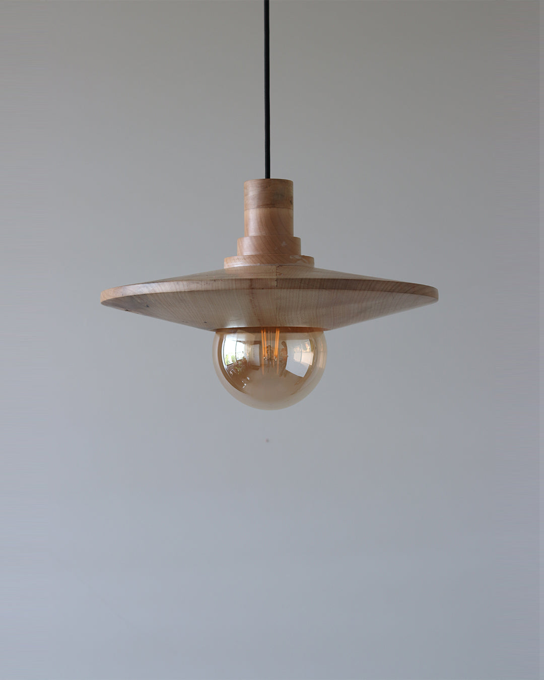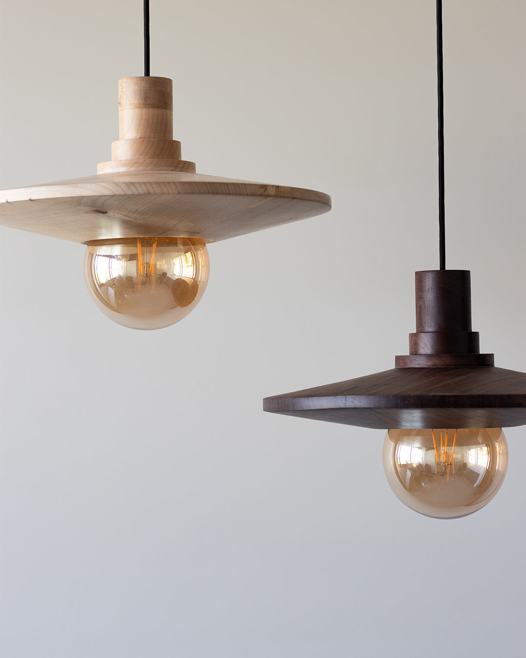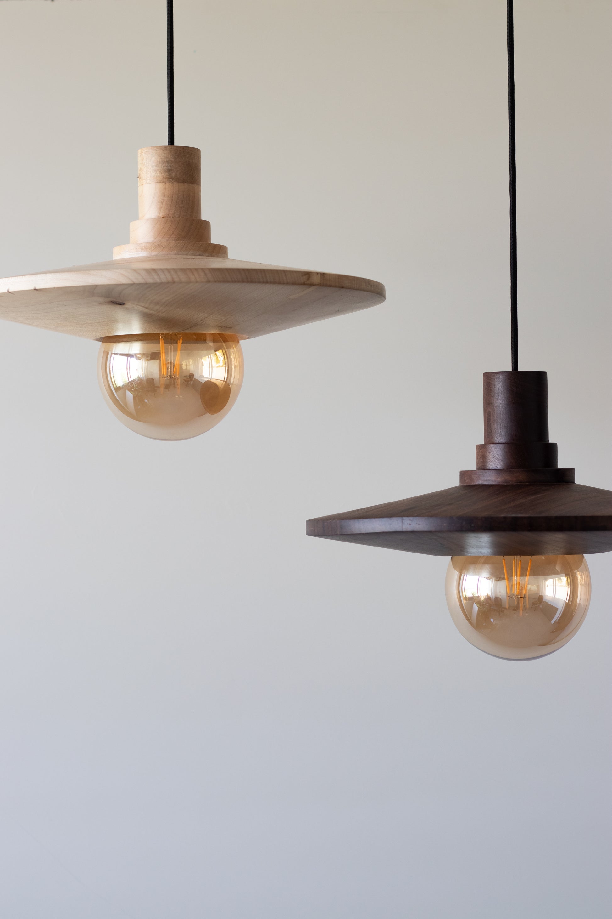 Sleek and sculptural, these walnut & Sycamore lamps define its material with a form that feels almost weightless. Like a quiet, hovering UFO, it carries a futuristic elegance, grounded in craft, yet reaching forward in design. Its clean silhouette glows with quiet confidence, making it a subtle statement in any setting.