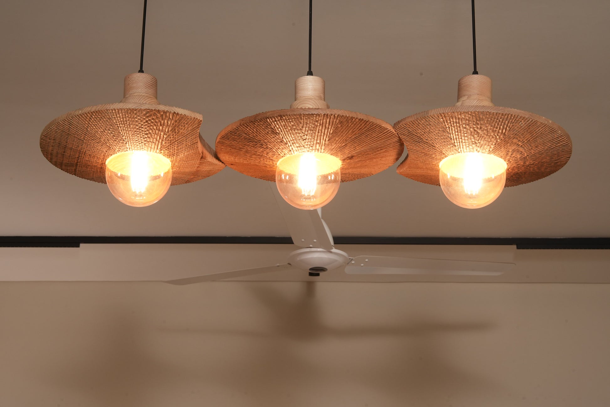 Hand-carved in Ash wood, each lamp reveals fine, rhythmic textures shaped patiently by skilled hands. Their sleek, sculptural forms hover like weightless UFOs—delicate, yet grounded in craftsmanship.