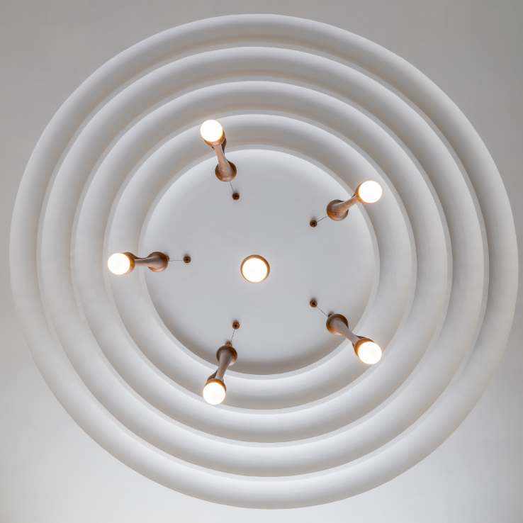 Suspended in mid-air, this set of five wood-turned lamps evokes the quiet elegance of nature in motion. Each form tapers and swells like something caught between a fall and a rise, reminiscent of a gentle drop, a wave, or the pull of gravity itself.