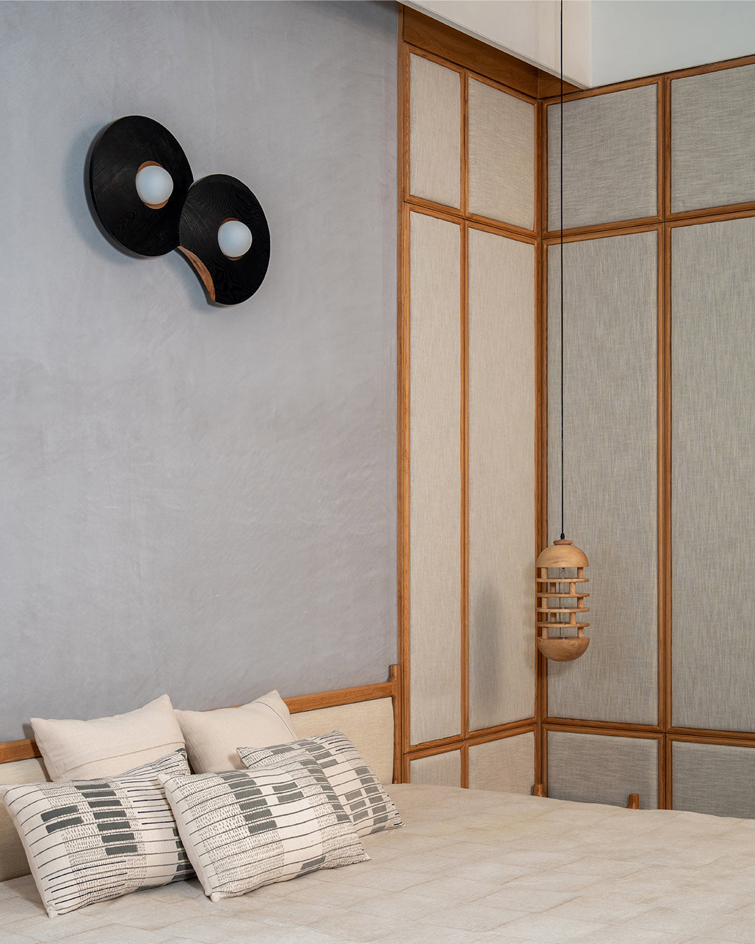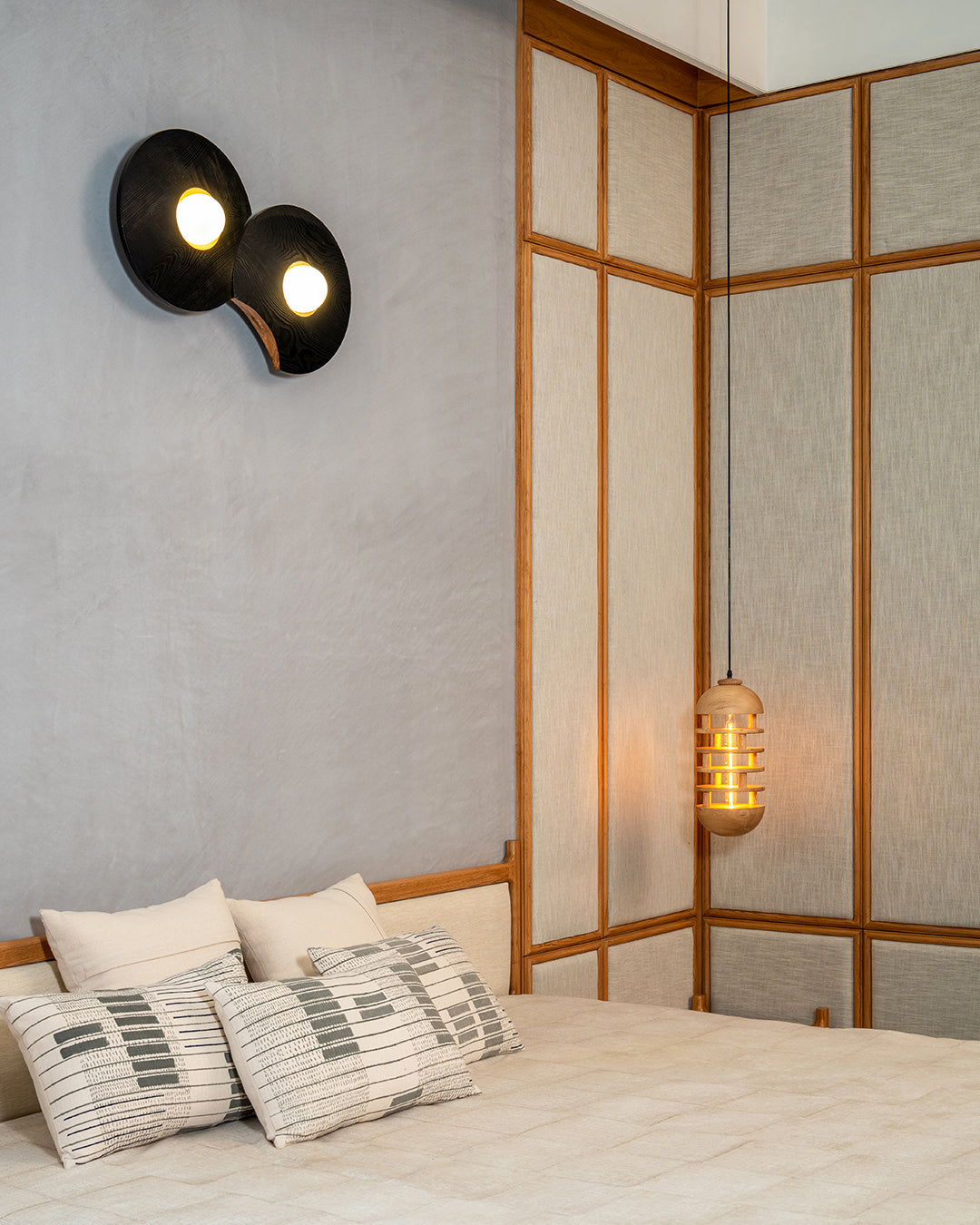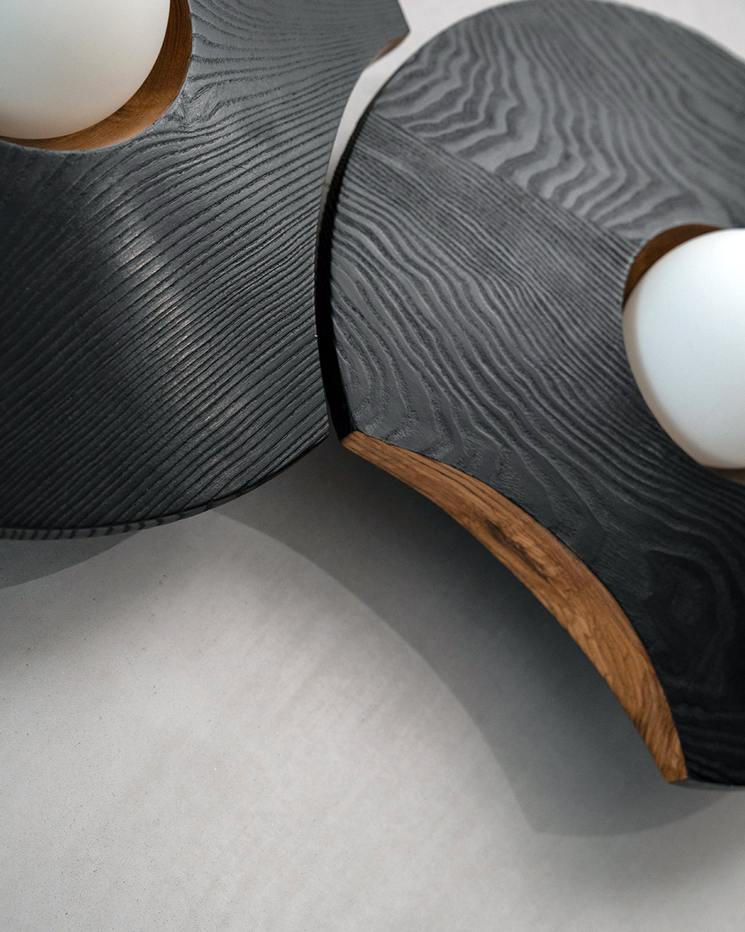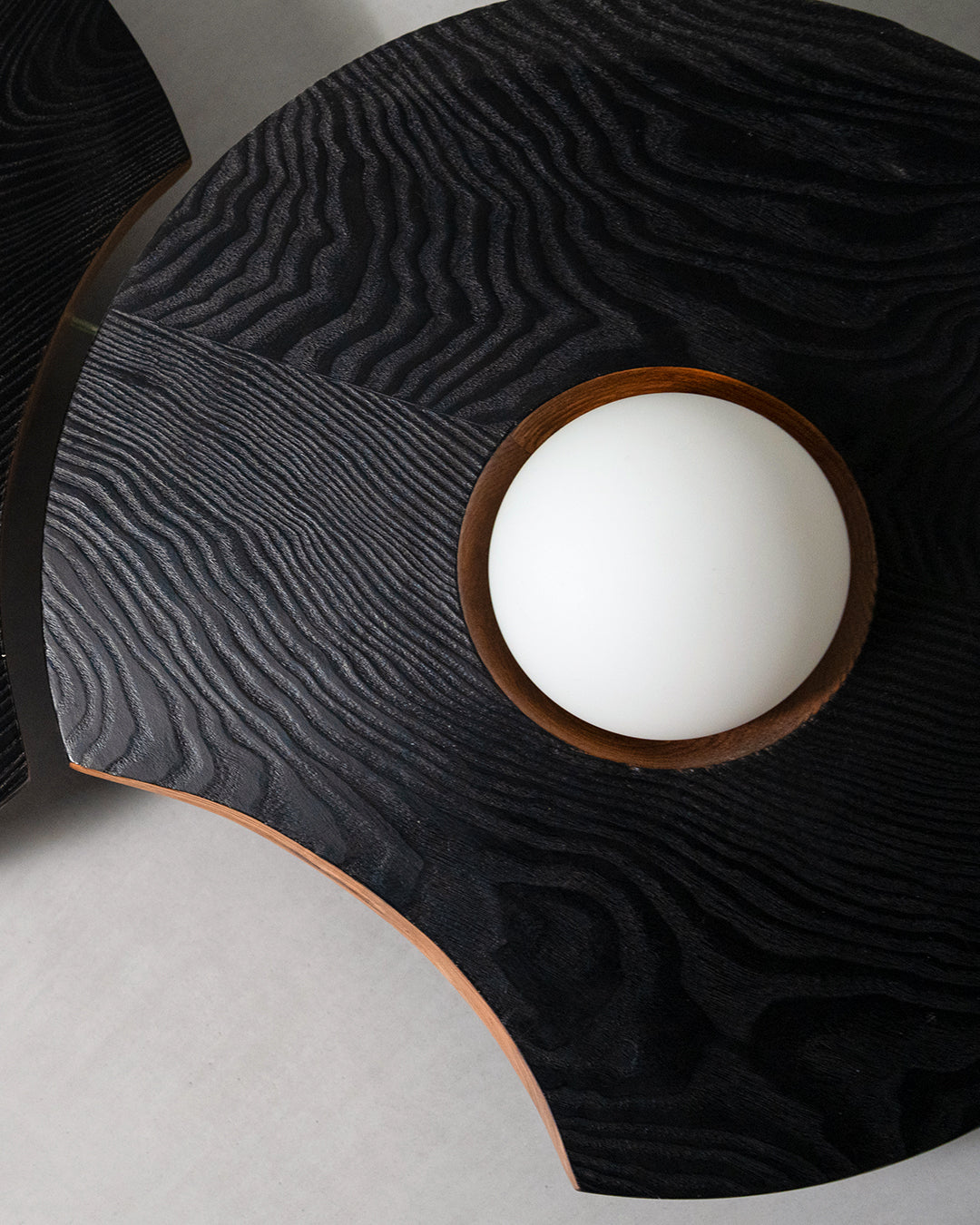 A simple, circular form that tapers inward to focus the light. The surface is textured and darkened through the Yakisugi technique, a traditional Japanese method of charring wood to enhance durability and bring out natural patterns. The minimalistic design embraces simplicity, allowing the organic textures and refined form to take center stage.