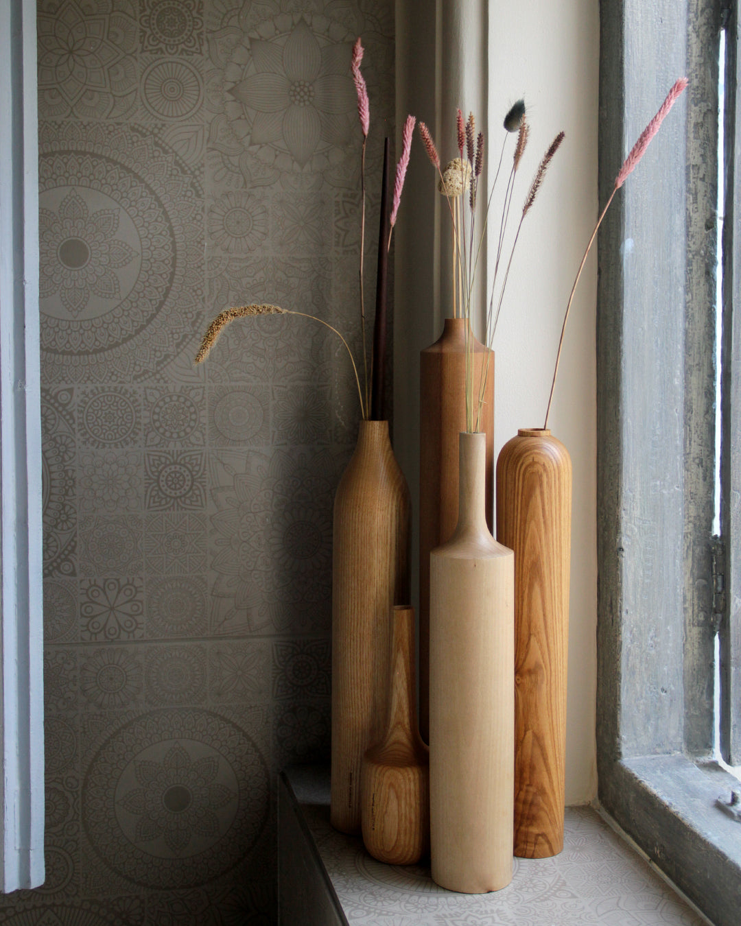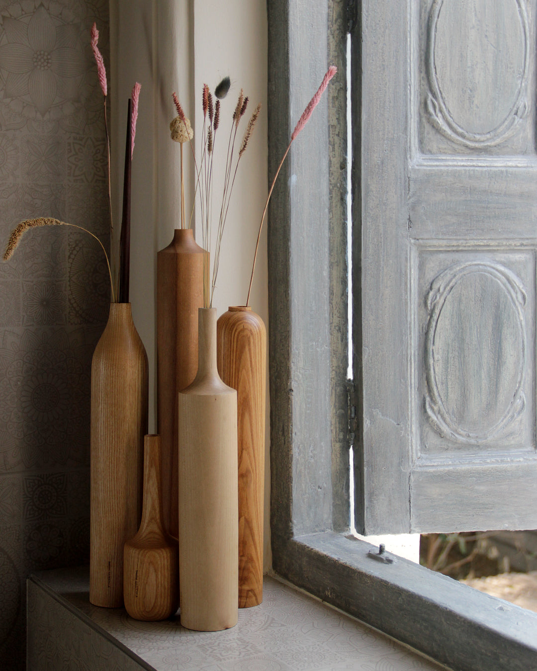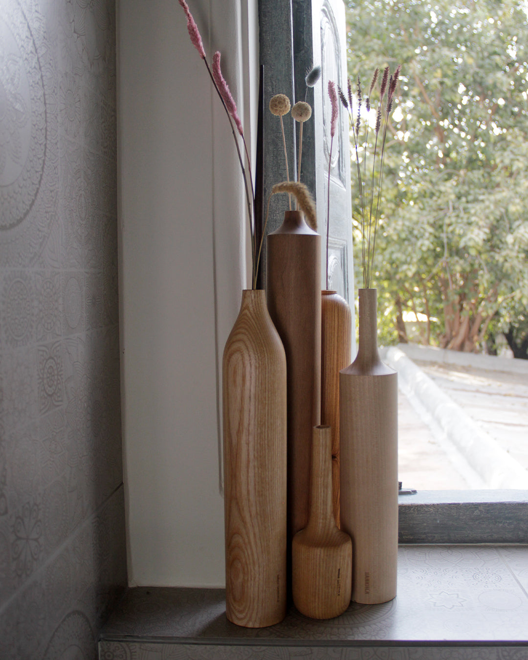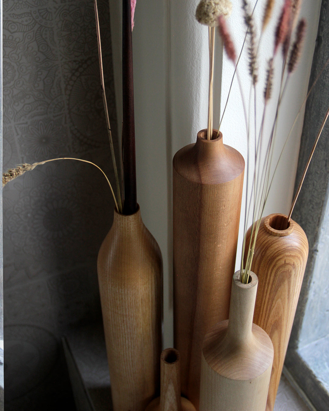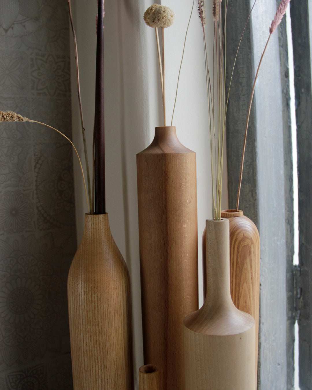A set of dried flower vases in Sycamore, White Ash, Teak and White Beech. Creating a light palette in the interiors, with forms inspired by the lines and curves. A set of bottle neck and round necks complementing each other. These vases reveal their soul in the hard material that forms them and in the harmonious encounter between seemingly simple geometric shapes, which make the entire design contemporary.