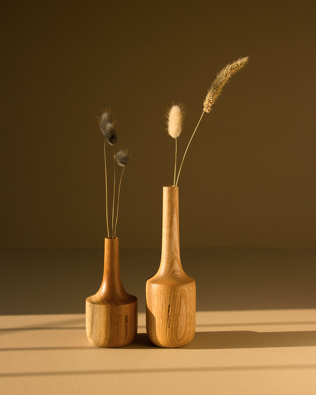 Dried flower vase with monolithic circular shape and a delicately thin spout, merging a monumental feel with a light contemporaneity. The smooth curves create a visual movement that lets the beauty of the natural wood shine.