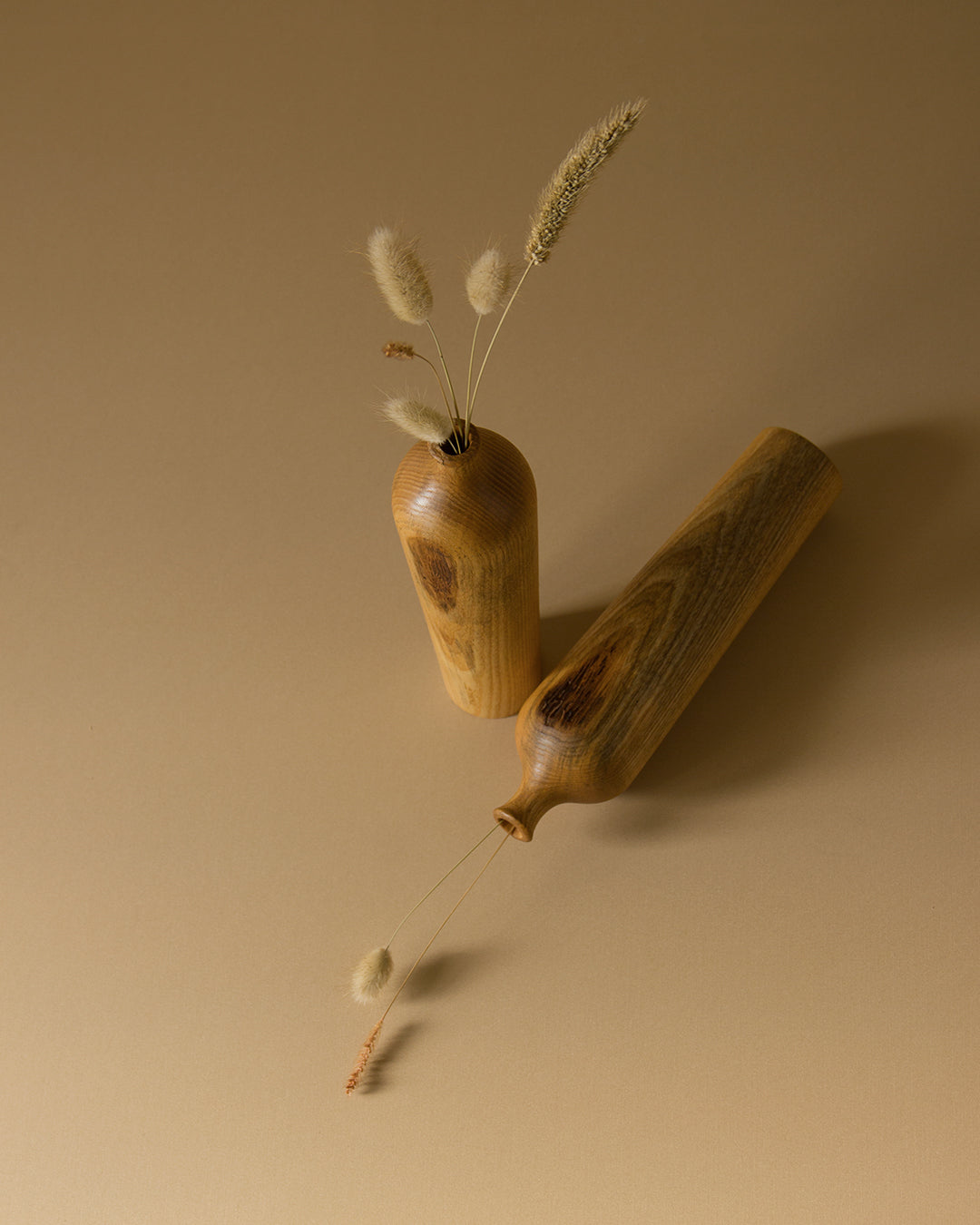A duo of White Ash dried flower vases. A vase with a sightly tapered body, a flared neck and rim that when exposed to daylight creates opportunities for poetic shadows. The form of this particular piece naturally follows the grain pattern of the wood which makes it distinctive.